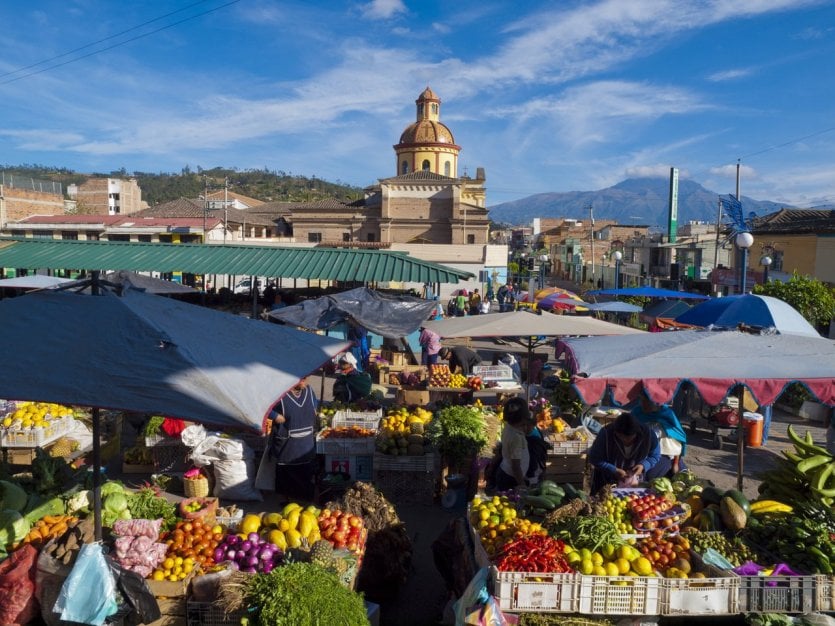 Otavalo ist ein Städtchen in der nördlichen Sierra und besonders berühmt dafür, dass es einen wunderschönen Markt beherbergt. Das Besondere an diesem Markt ist in erster Linie, dass er als der vielfältigste, größte und billigste Markt auf dem südamerikanischen Kontinent gilt. Man muss ihn an einem Samstag und recht früh besuchen, denn dann sieht man am besten die Indianer auf Eseln und andere, die ihre kleinen schwarzen Schweine an der Leine zu den Viehmärkten ziehen, ankommen. Der Markt vonOtavalo besteht nämlich aus drei verschiedenen Märkten: dem Viehmarkt, dem Obst- und Gemüsemarkt, auf dem man einige Spezialitäten probieren und sehr schöne Töpferwaren kaufen kann, und dem alten Indianermarkt, der ideal ist, um mit wunderschönen Stücken des lokalen Kunsthandwerks wie Pullovern, Teppichen, Decken, Schmucktaschen und anderen Kleinigkeiten nach Hause zu gehen.