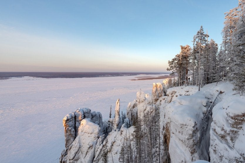 Der Naturpark Lena-Säulen ist für seine beeindruckenden Felssäulen bekannt. Aufgrund dieser natürlichen Schönheit gehört er seit 2012 zum UNESCO-Weltkulturerbe. Es hat einen ganz besonderen Reiz, im Winter an diesem herrlichen Ort zu wandern, um die spektakulären, fast 100 Meter hohen Felssäulen zu entdecken, die sich am Ufer des Flusses Lena entlangziehen. Die Säulen entstanden aufgrund der jährlichen Temperaturschwankungen von fast 100 °C, die von Wintern mit bis zu -60 °C bis zu Sommern mit bis zu 40 °C reichen