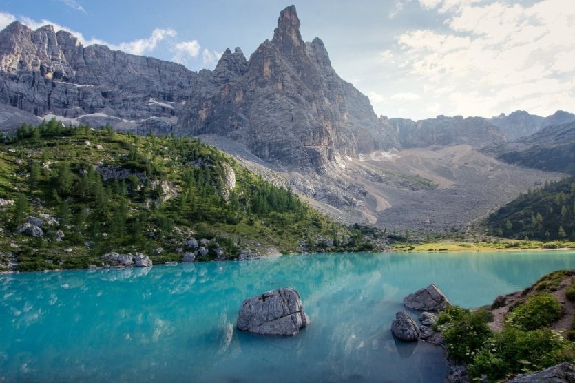 Nach dem Lago di Braies ist der Lago di Sorapis (1925 m) der andere See, den man in den Dolomiten gesehen haben muss. Er ist bekannt für sein kristallklares Wasser und seine intensive blaugrüne Farbe, die je nach Lichtverhältnissen und Temperatur variiert. Seine türkise Farbe verdankt er dem Staub des Gletschers. Umgeben von spektakulären Klippen und Felsgipfeln gilt er als einer der schönsten Bergseen der Dolomiten. Um ihn zu erreichen, muss man nur einen etwa 5 km langen Wanderweg von der Vandelli Hütte aus nehmen. Die Wanderung lohnt sich auf jeden Fall!