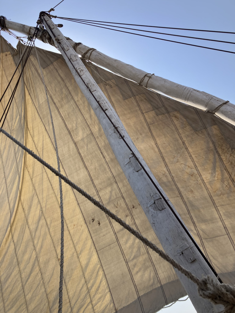 Die Idee schien ebenso verrückt wie verlockend und schließlich waren diese Boote für den heiligen Fluss und seine tausend Launen gemacht, ein Rumpf, der sich perfekt an die wilden Ufer schmiegt, um dort zu wandern. Die Segel, sobald die Masten zusammengesetzt sind, ermöglichen eine stille Fahrt, bei der der Wind der Sahara in den Palmen knistert.
