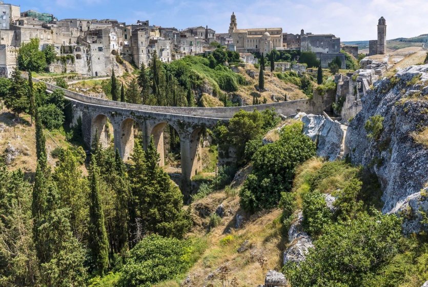 In Apulien ist die Vielfalt der Landschaften so groß, dass es sogar Canyons gibt! Zwischen den Murge und dem Ionischen Meer bricht das Land auseinander und es entstehen die Gravine, beeindruckende Schluchten, die in den Fels gegraben wurden und über 100 m tief sind. In Gravina in Puglia, an der Grenze zur Basilicata, kann man dieses Phänomen in einer mit Felswohnungen durchsetzten Gravina beobachten. In der Mitte des Canyons befindet sich die Kirche San Michele, die ein wahres Juwel ist.