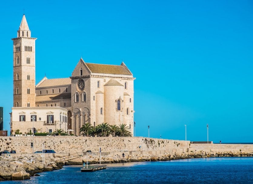 Die Architektur Apuliens ist von seinen charakteristischen romanischen Kathedralen geprägt, die über die Hafenstädte zu wachen scheinen. Die apulische Romanik erlebte ihre Blütezeit zwischen dem 11. und 12. Jahrhundert, nachdem die normannischen Ritter in Süditalien gelandet waren. Die 1143 fertiggestellte Kathedrale von Trani, die San Nicola Pellegrino geweiht ist, ist eines der repräsentativsten Beispiele für diesen Stil. Die schlichte Fassade aus weiß-rosa Marmor hebt sich vom Blau des Meeres ab, das sie überragt.