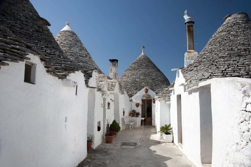 Im Itria-Tal zwischen den Provinzen Bari, Taranto und Brindisi wird die Landschaft von Wohnhäusern mit Kegeldächern geprägt , die größtenteils im 16. Jahrhundert erbaut wurden: die Trulli . Diese Häuser zeugen von einer prähistorischen Bautechnik, bei der ohne Mörtel und mit trockenen Steinen gebaut wurde. Sie sind besonders in dem zum UNESCO-Weltkulturerbe gehörenden DorfAlberobello konzentriert, wo es mehr als 1500 Trullis gibt.